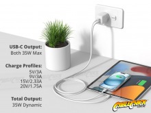 Please note: This charger has a 35W max/total output. It can charge one device at the full 35W (eg 20V/1.75A) or two devices together at a lower speed (eg 2 x 5V/3A)