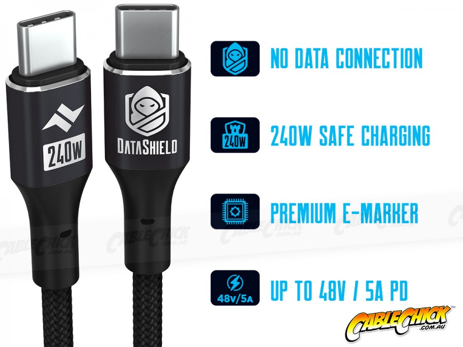 Safeguard your mobile devices and computer systems from malicious code with a power-only DataShield cable supporting up to 240W of power delivery with no data connection. Protects phones and laptops from device-hijacking (juice jacking) in any public place, including airports, cafes, waiting rooms and during flights.