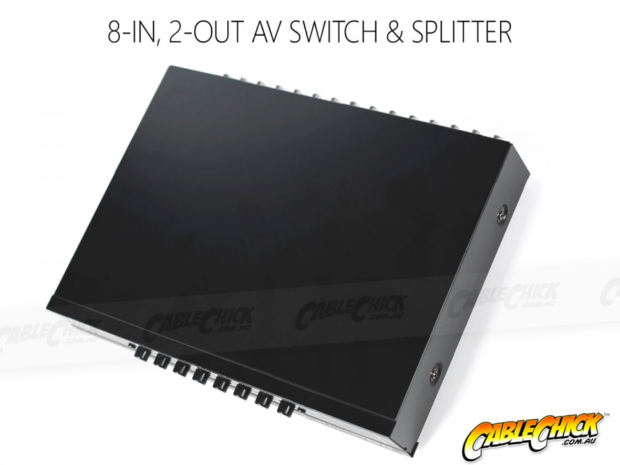 This AV switcher and splitter takes up to 8x 3RCA inputs (composite video + stereo audio), and outputs the input to 2 x outputs simultaneously! So you get the best of an 8-Port AV switch and 2-Way AV splitter all in one!