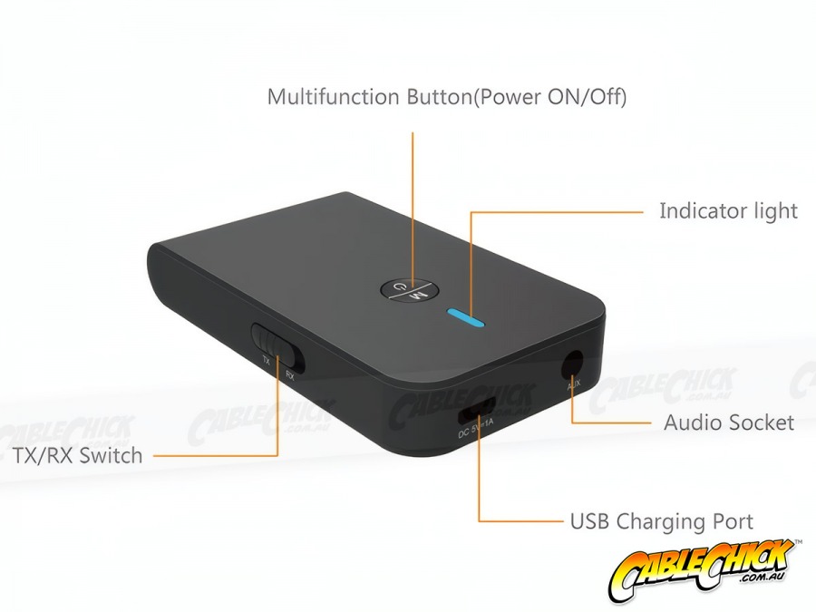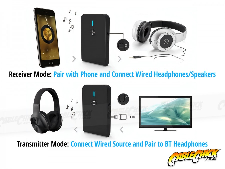 Adds wireless Bluetooth functionality to any audio device that relies on 3.5mm stereo. In Receiver mode, you can pair your phone and play stream music to any speaker, head unit or receiver with AUX in. In Transmitter mode, play audio from the headphone output on your TV, handheld games console or CD Walkman and pair to your Bluetooth headphones!