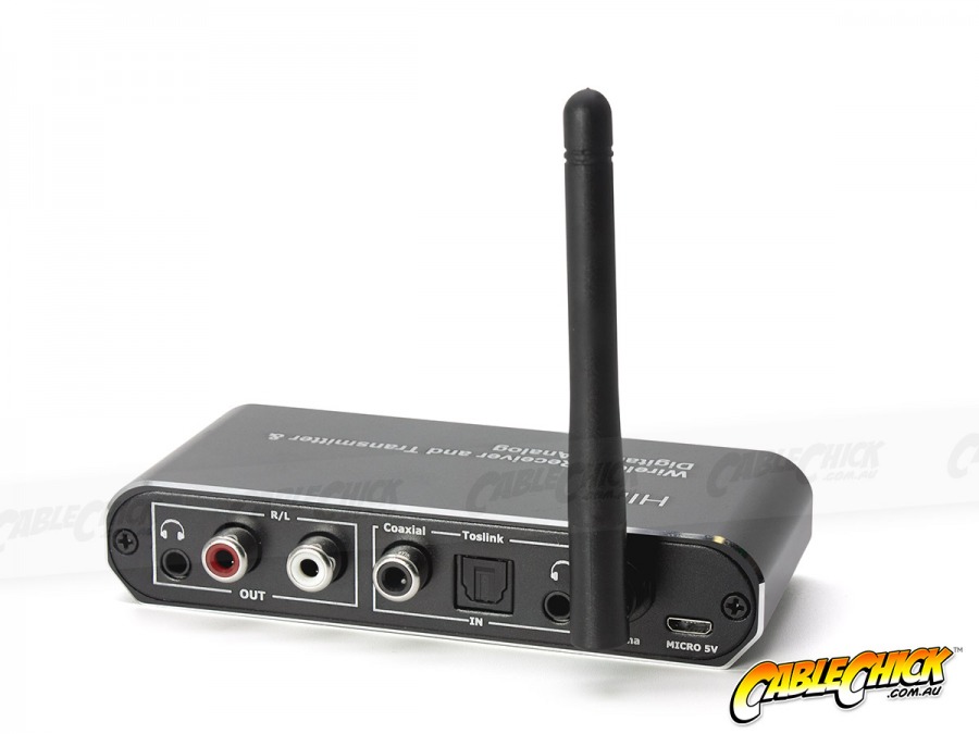 This handy little Transceiver unit works in two ways. Basically, you can plug in an audio source via SPDIF Coaxial or TOSLINK, or via 3.5mm stereo input (one at a time). That input will be converted to analogue stereo and also broadcast as Bluetooth audio. In this configuration, you can convert Digital to Analog for a wired DAC, or sync your Bluetooth Speakers to listen to the input wirelessly.